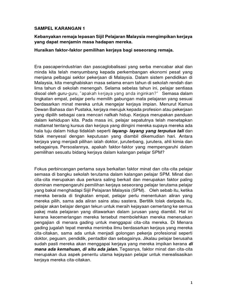Sampel Karangan 1 Faktor Faktor Pemilihan Kerjaya Bagi Seseorang Remaja Pdf